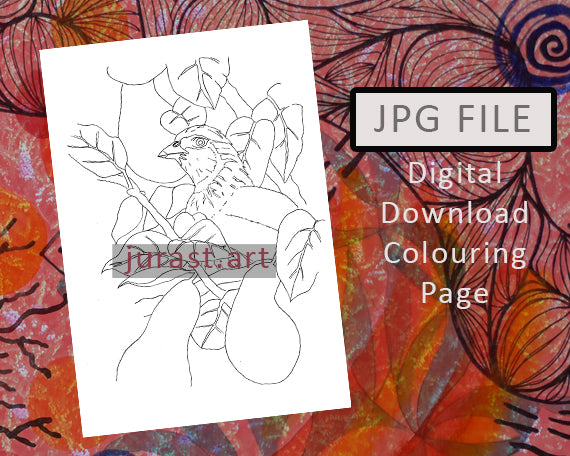Christmas Animal, Partridge, colouring page for adults and children, instant download, printable file, line art illustration, hand drawn by artist Julian Raymond Stanley of jurast.art.