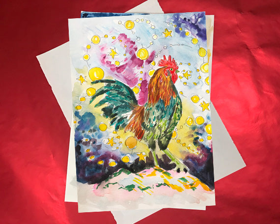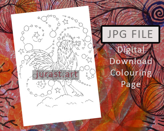 Christmas Animal, Cockerel, colouring page for adults and children, instant download, printable file, line art illustration, hand drawn by artist Julian Raymond Stanley of jurast.art.