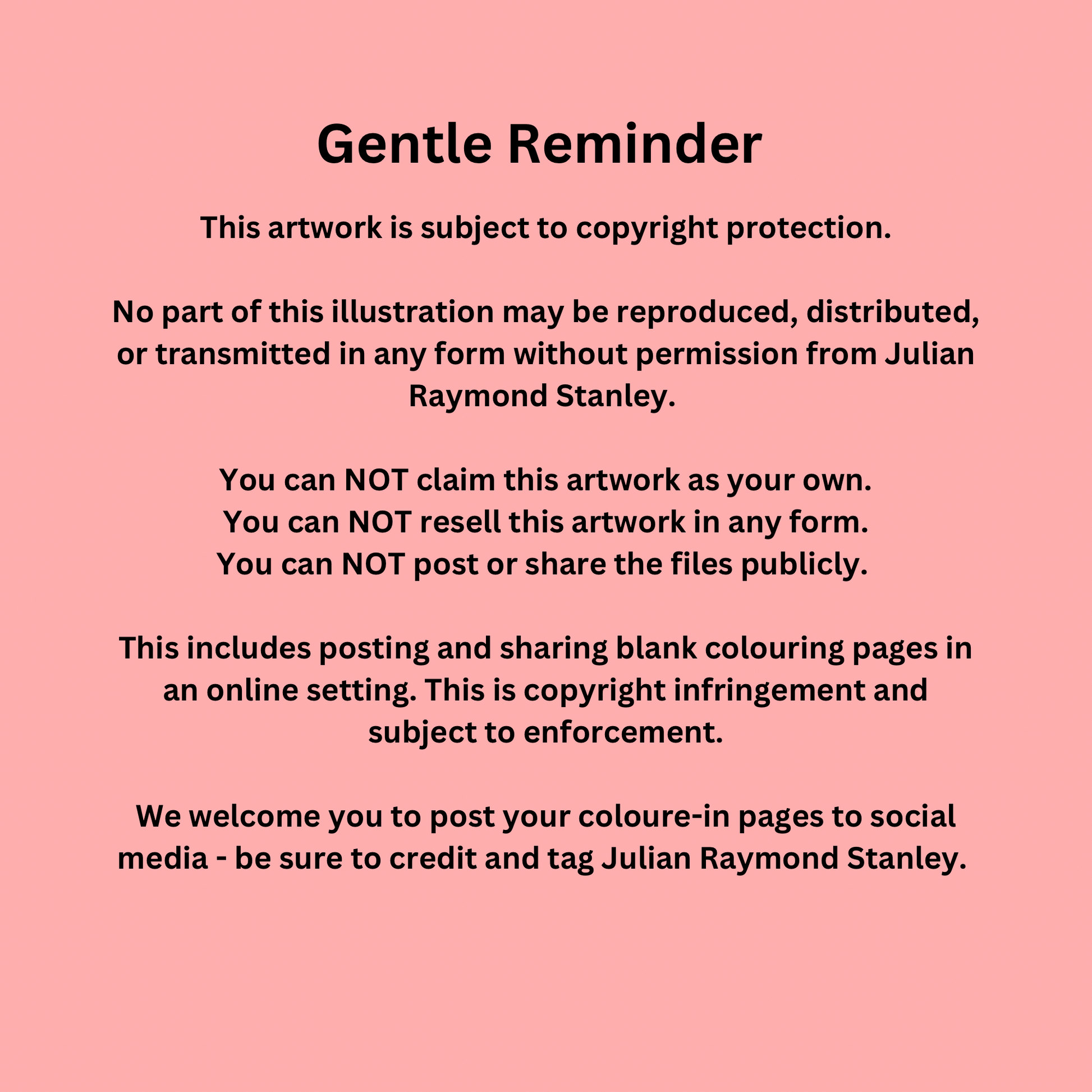 Christmas Animal, Donkey, colouring page for adults and children, instant download, printable file, line art illustration, hand drawn by artist Julian Raymond Stanley of jurast.art.