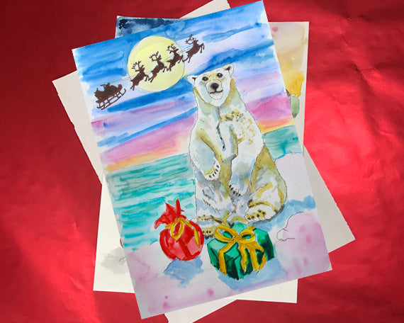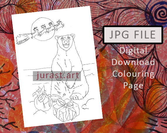 Christmas Animal, Polar Bear, colouring page for adults and children, instant download, printable file, line art illustration, hand drawn by artist Julian Raymond Stanley of jurast.art.