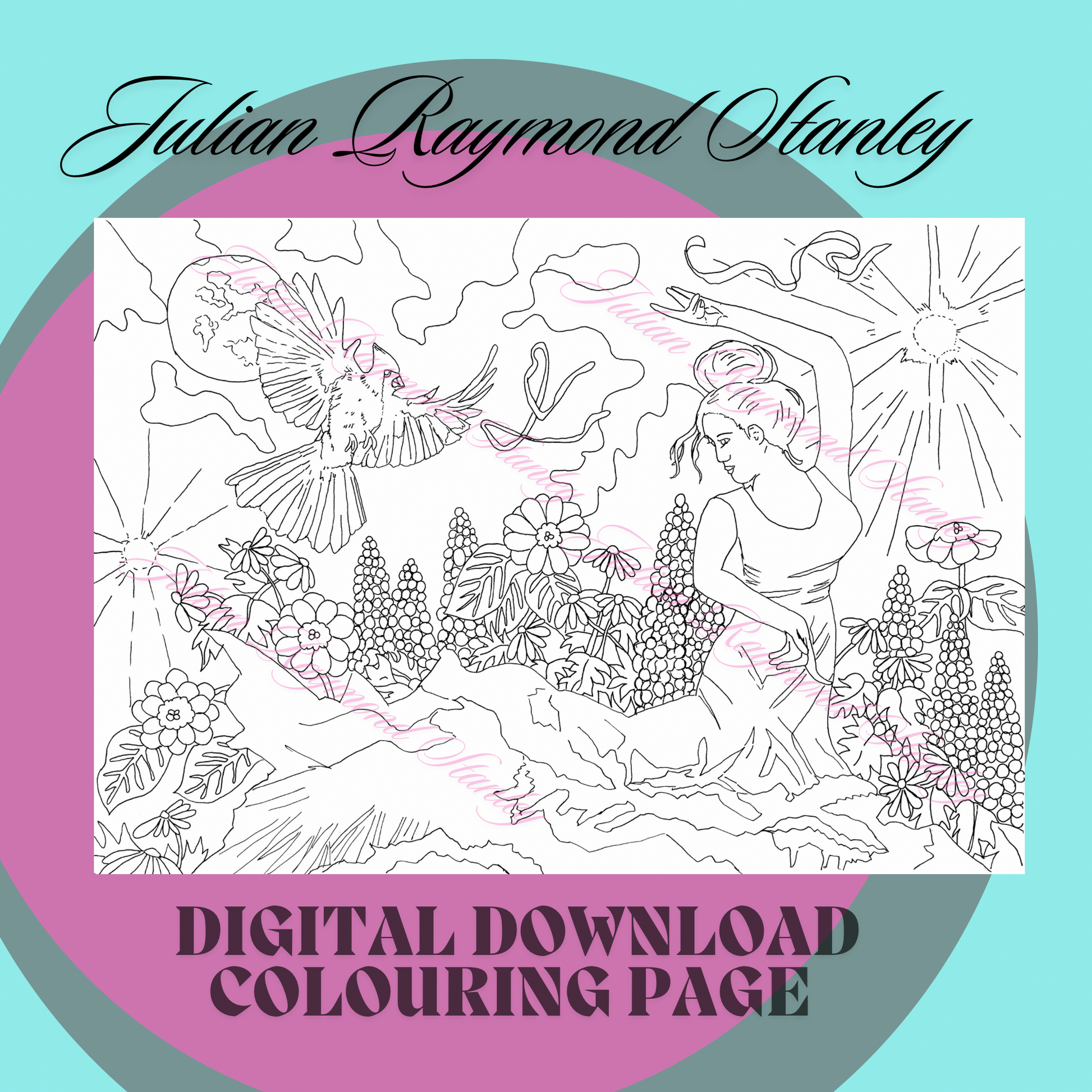 Portrait of woman dancing under the moon in a flower garden. Great for adults and children to colour. Instant download, printable files by artist Julian Raymond Stanley of jurast.art.